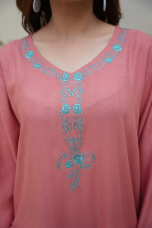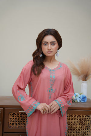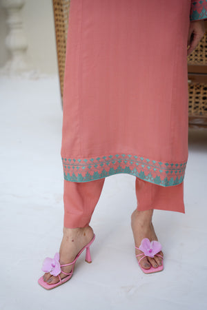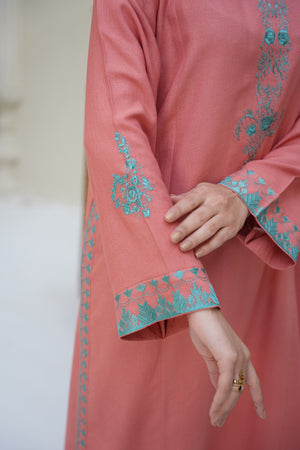 Soft, feminine, and effortlessly elegant—Blush Ember is crafted from premium silk karandi, offering a refined look perfect for daytime events, casual gatherings, and seasonal wear. The warm blush-pink base pairs beautifully with delicate teal embroidery, creating a harmonious and eye-catching design.