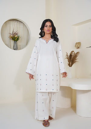 Elegance meets simplicity in this white embroidered suit featuring a round neckline with a v-slit, wide trousers, and a beautifully printed Manar dupatta. A graceful everyday ensemble with refined detail.