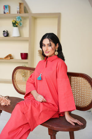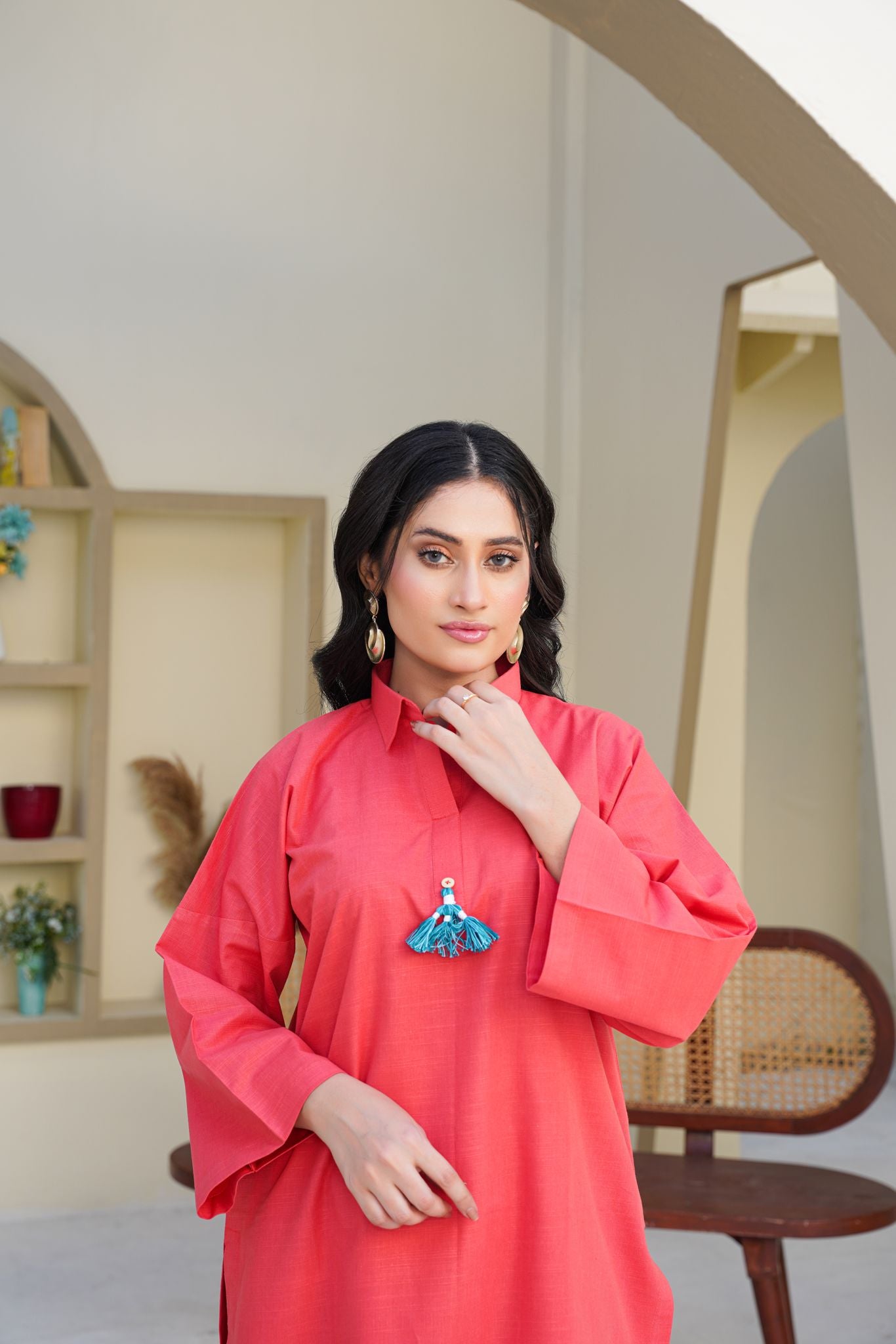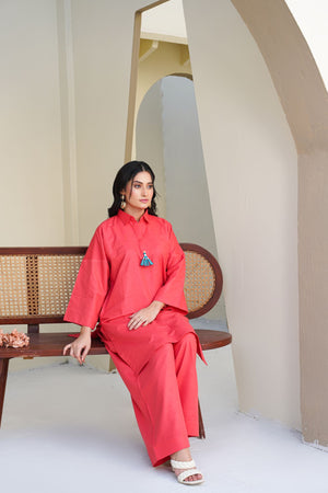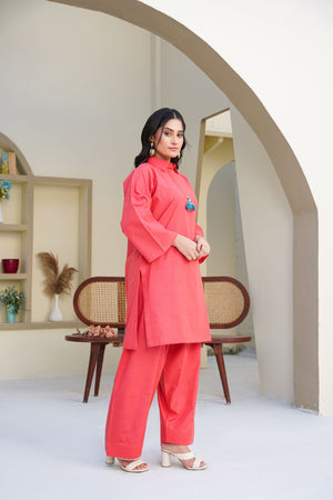 Brighten your wardrobe with our Coral 2 Piece Co-Ord Set — a vibrant fusion of elegance and comfort. Crafted from soft yet durable slub khaddar, this outfit embodies effortless sophistication with its rich coral hue.