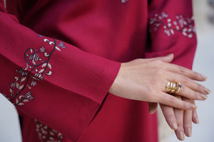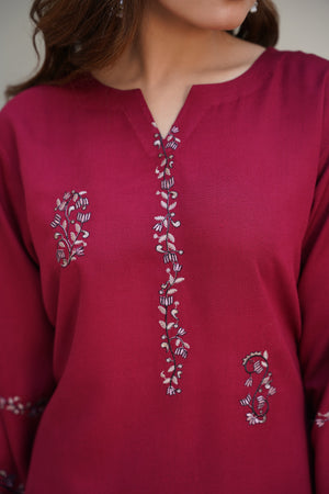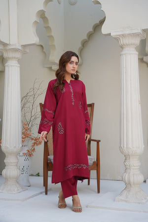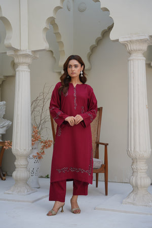 Rich, warm, and irresistibly elegant—Garnet Glow brings a touch of luxury to your wardrobe with its deep garnet red hue and delicately detailed embroidery. Crafted from premium silk karandi, this stitched two-piece is perfect for winter soirées, family dinners, or elevated everyday style.