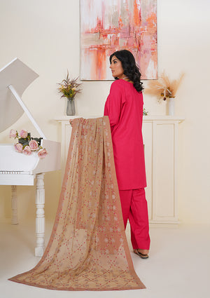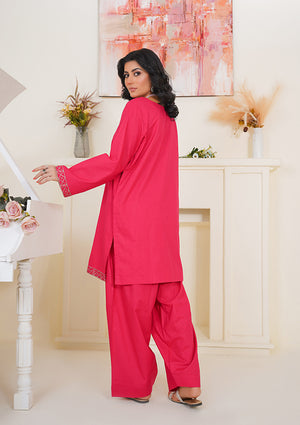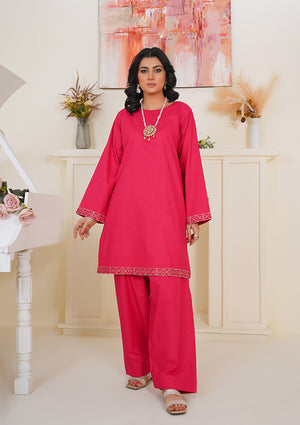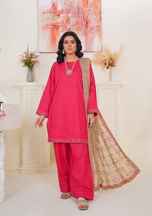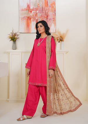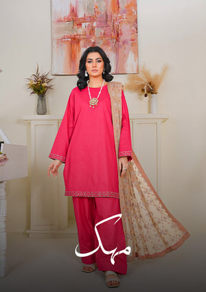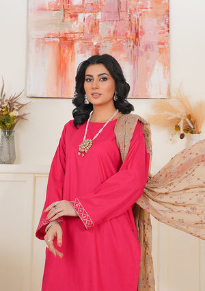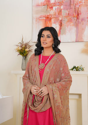 Vibrant and detailed, this magenta suit includes a straight shirt with an embroidered neckline and shirt border, scalloped trousers, and a printed Manar dupatta for a layered yet coordinated look.