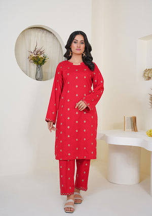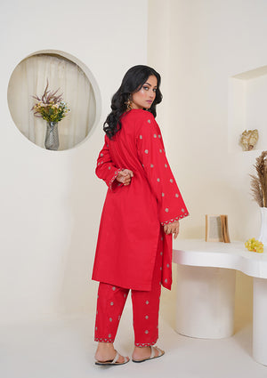 A bold statement in red. This straight-cut embroidered shirt with a round neckline is paired with wide trousers and a vibrant printed Manar dupatta—perfect for those who love classic drama.