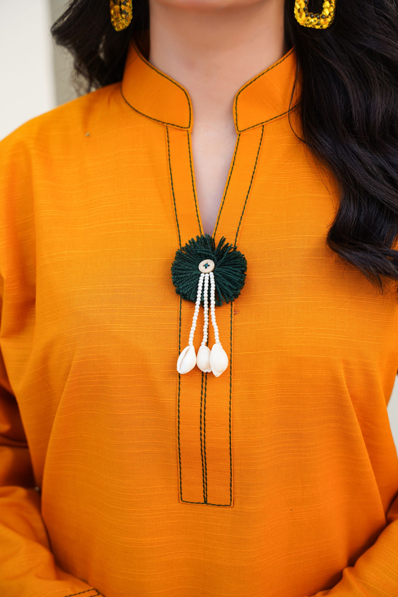 The kurta features a graceful straight silhouette with dark forest green stitching and a beautifully detailed tassel accent. The tassel’s deep green pom-pom base is enhanced with white beads and delicate cowrie shells, creating an eye-catching contrast against the rich saffron hue. Paired with matching straight trousers, this set is designed for timeless elegance and effortless style.