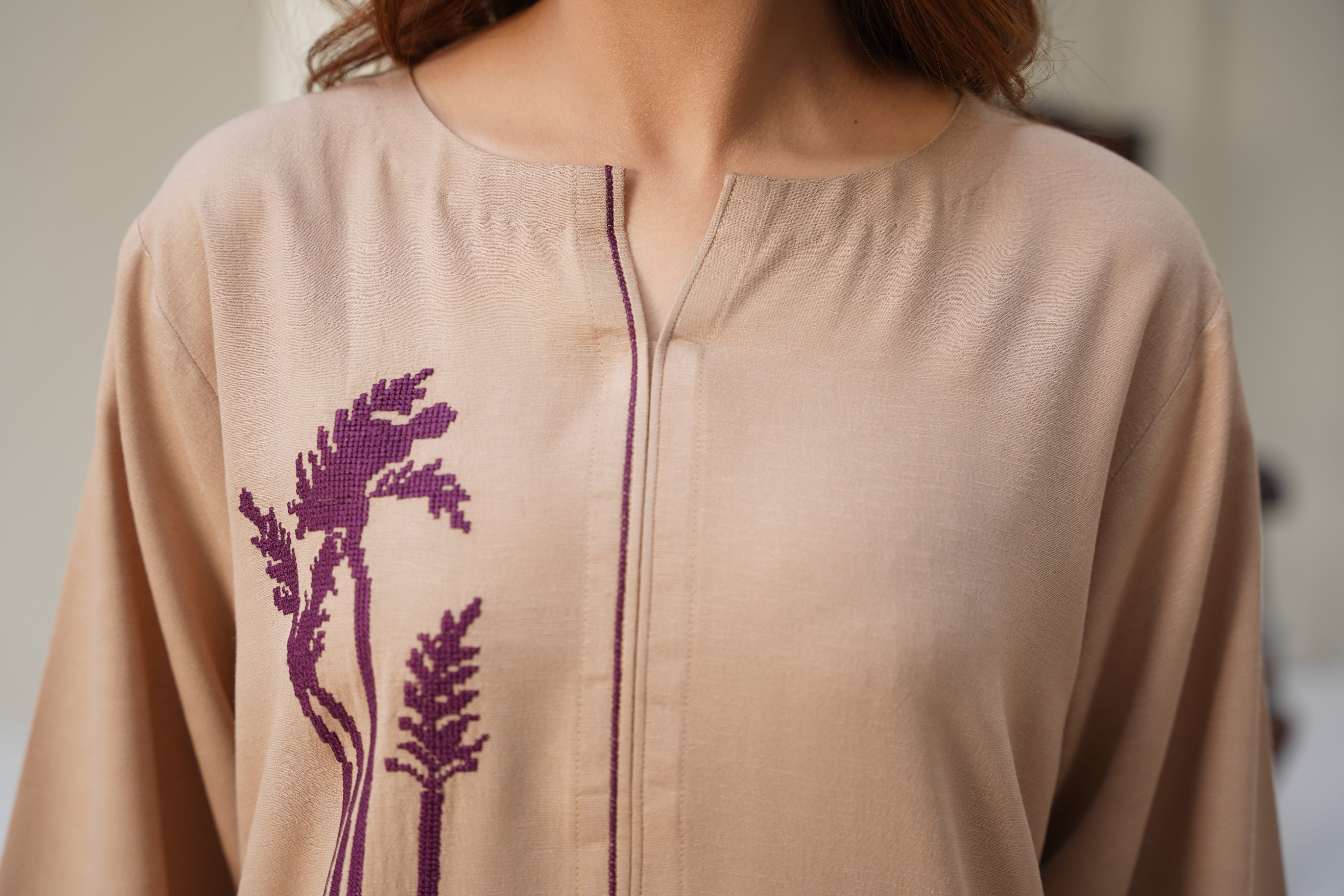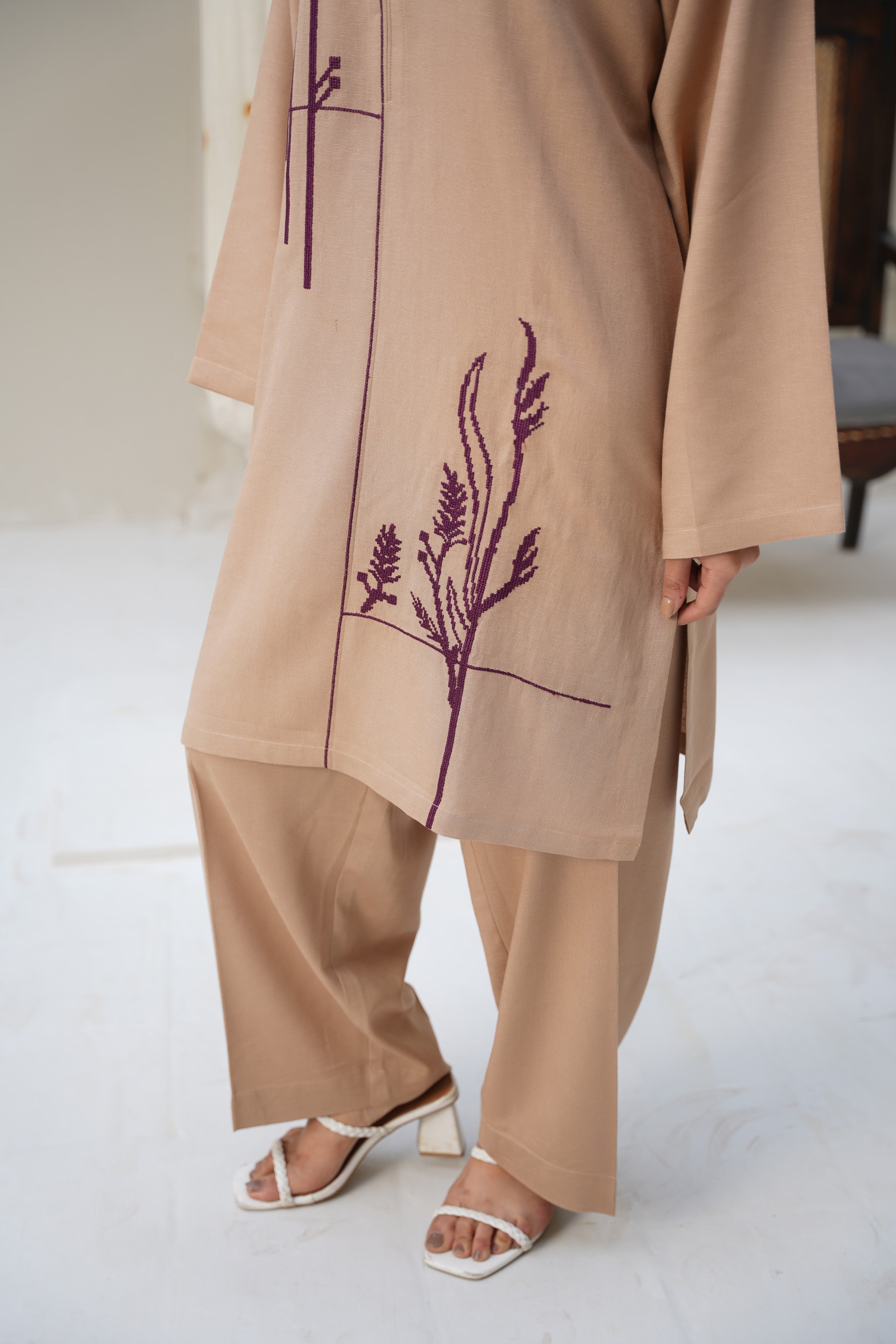 The shirt features a relaxed straight silhouette with deep purple botanical embroidery on the front, adding an artistic and modern touch. A clean mandarin-inspired neckline and long sleeves keep the design minimal yet classy. The matching wide-leg trousers complete the look with effortless grace.