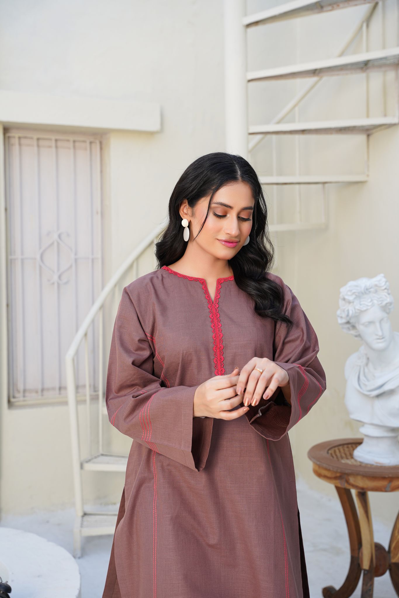 The kurta features clean lines and wide sleeves, beautifully accentuated with bright fuchsia pink lace and contrast stitching that add a pop of vibrancy to the muted taupe base. Paired with matching straight trousers, this co-ord set embodies polished minimalism with a hint of playful color.